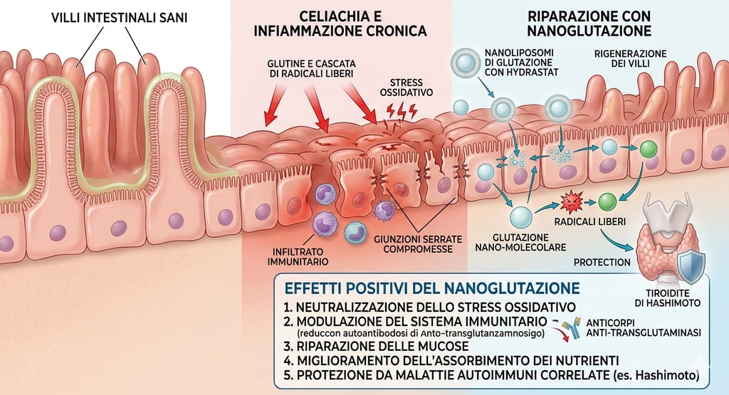 Uno degli aspetti più straordinari del nanoglutatione è la sua capacità di immunomodulazione. Nella celiachia, il corpo produce anticorpi (come gli anti-transglutaminasi) che attaccano le proprie stesse strutture. Il nanoglutatione aiuta a "calmare" questa risposta aberrante: riducendo lo stress ossidativo nelle cellule immunitarie, diminuisce la produzione di segnali pro-infiammatori e aiuta a riportare il sistema verso uno stato di tolleranza, riducendo l'aggressività auto-anticorpale.